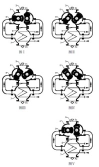冷卻氣體從泵體的兩側(cè)進(jìn)入泵的吸氣腔,使泵不會因壓縮氣體而出現(xiàn)過熱,但對泵的抽氣性能沒有任何影響。右圖Ⅰ至圖Ⅴ 是轉(zhuǎn)子在泵腔內(nèi)旋轉(zhuǎn)并完成一次吸、排氣的過程。