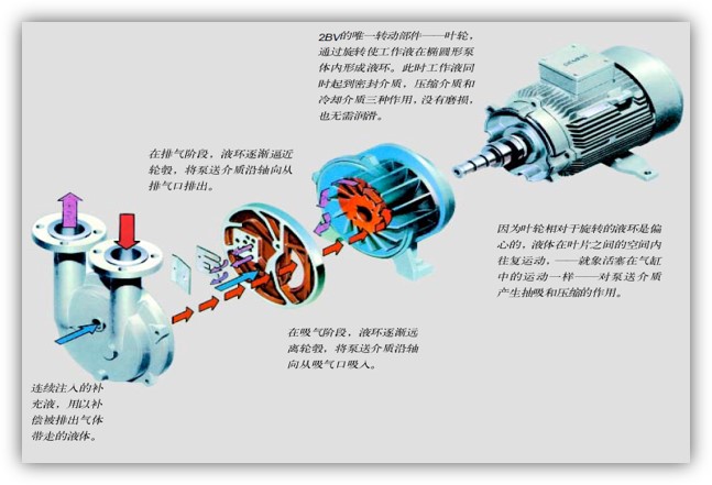 水環式真空泵在連續不斷的工作過程中,做功產生熱量,會使工作液溫度升高,一部分水氣和氣體一起被排走,因此,水環真空泵在工作過程中,必須不斷地給泵供水,以冷卻和補充泵內消耗的水,滿足泵的工作要求。