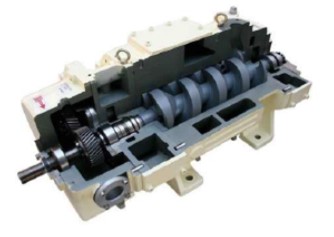 螺桿干式真空泵是通過泵腔內一對作等速反向旋轉螺桿的嚙合作用,完成從吸入氣體、壓縮氣體到排出氣體而形成高真空過程。即兩個旋向相反的非接觸螺桿型轉子在泵腔內做等速反向旋轉。當螺桿旋轉時,在螺桿真空泵的進口處吸入一定體積量的氣體,氣體被壓縮并輸送到真空泵的排出口處被排出。由于泵的二個螺桿之間以及螺桿與泵腔之間均無接觸,泵腔內不需要潤滑油。用于潤滑齒輪和軸封的潤滑油通過軸封與泵腔密封。泵的冷卻可以通過循環冷卻水直接冷卻或者通過帶有風扇及散熱器的冷卻裝置進行冷卻。